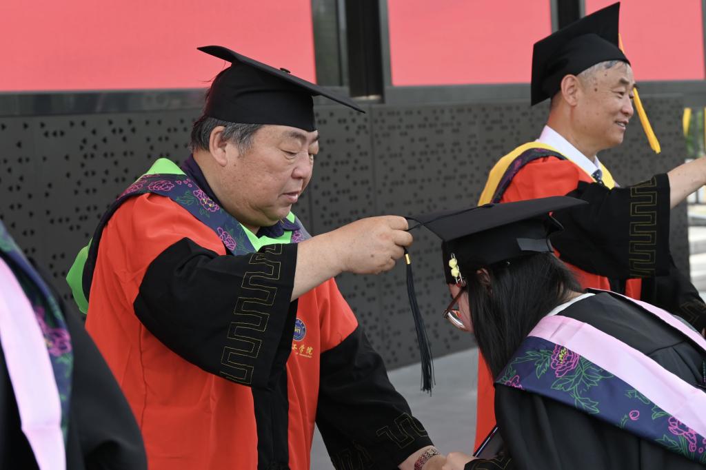 副校长杨秀英宣读授位决定。校领导为毕业生代表拨穗正冠,授予学位。