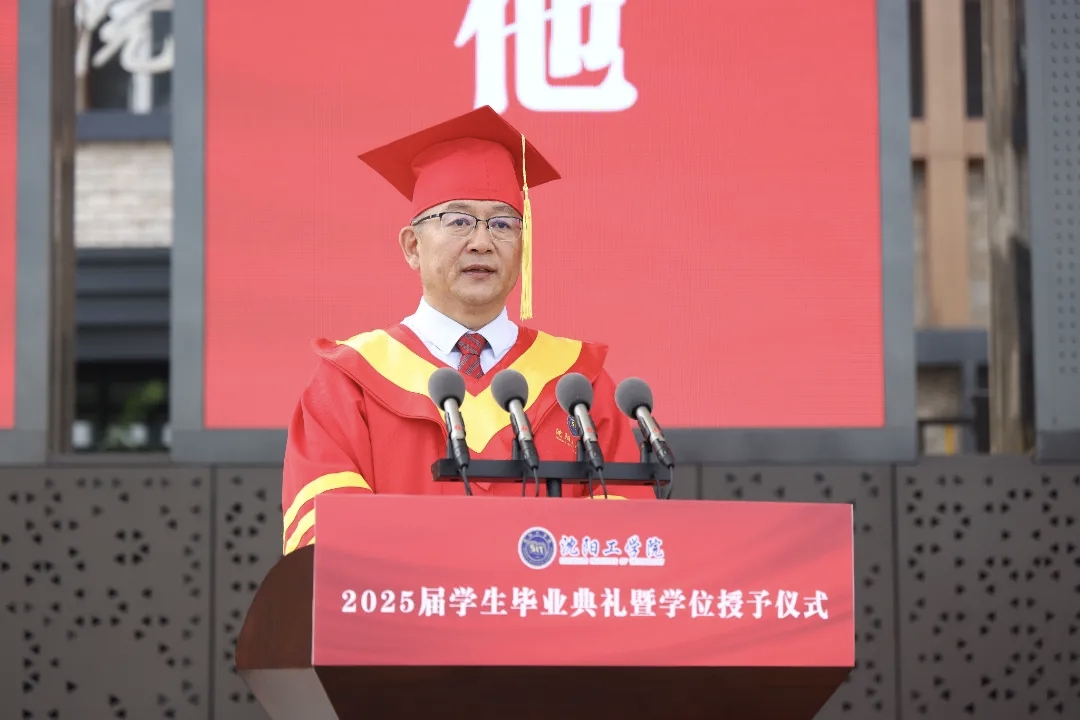校长李康举和同学们一起回忆了大学四年丰富多彩的生活,为毕业生们送上嘱托与祝福,字字句句饱含深情,既有对同学们过去努力的肯定,也有对未来征程的期许。学校紧跟时代发展脚步,为同学们搭建了非常好的成长成才平台。智能化实践教学中心、实验室相继建成,19个与国内外知名企业共建的现代产业学院拔地而起。让人工智能、大数据、数字孪生等前沿技术不再是课本上的概念,而是同学们可以亲手触摸的“创新工具”。沈工不仅赋予大家直面职场挑战的底气,更让同学们懂得:在巨大的变革面前,要勇于站在时代的潮头,勇敢地拥抱先进技术。他送给沈工毕业生三句话:要保持终身学习的习惯,培养不可替代的价值,坚守向善的初心。他希望同学们始终拥有“自信人生二百年,会当水击三千里”的豪情,更需要有“衣带渐宽终不悔,为伊消得人憔悴”的不懈努力。