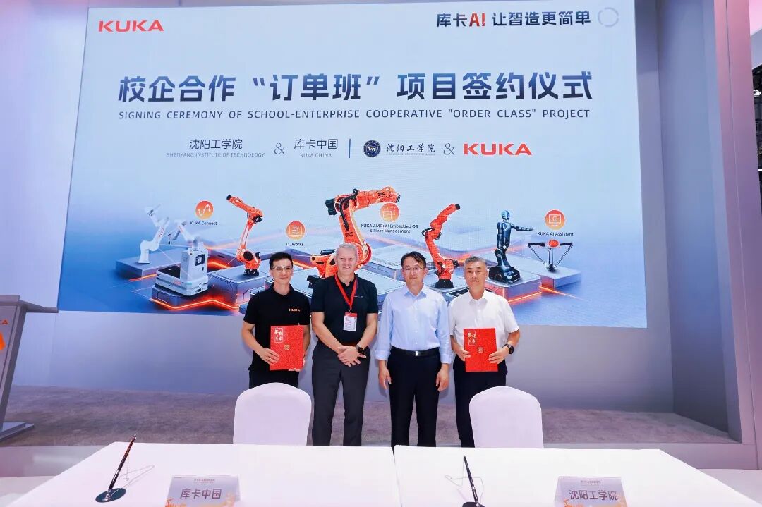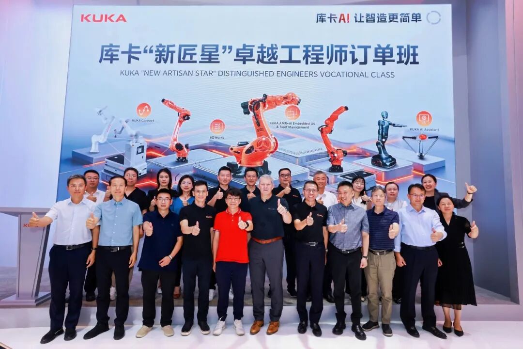 作为双方合作的核心载体,“新匠星”卓越工程师订单班创新构建“共定方案、共建课程、共组教学、共评质量”的“五共”深度融合机制。该机制以企业真实项目为驱动,将库卡机器人典型应用案例和最新行业标准全面融入专业课程体系,形成从基础操作到系统集成、从仿真设计到实战调试的多层次能力培养路径,助力学生成长为符合产业需求的技术人才。